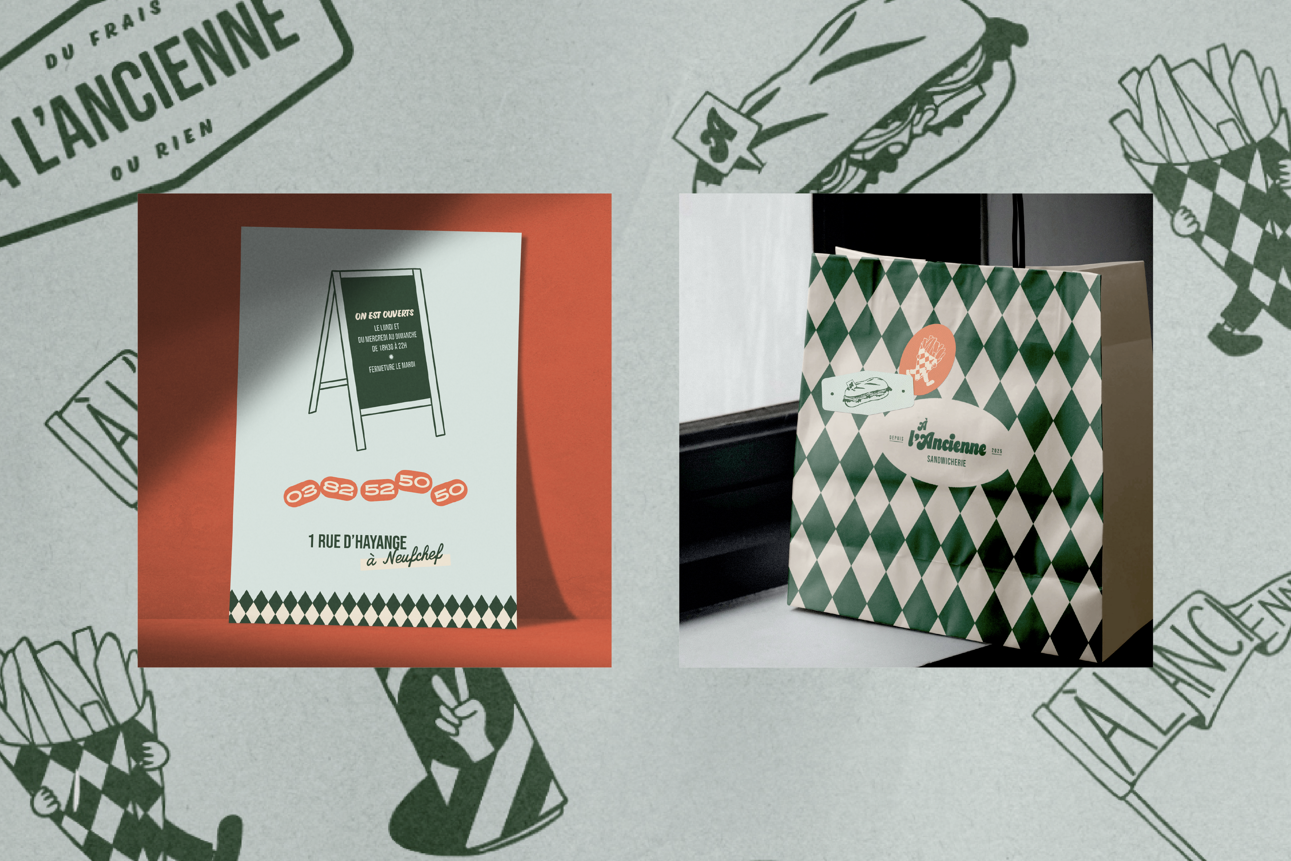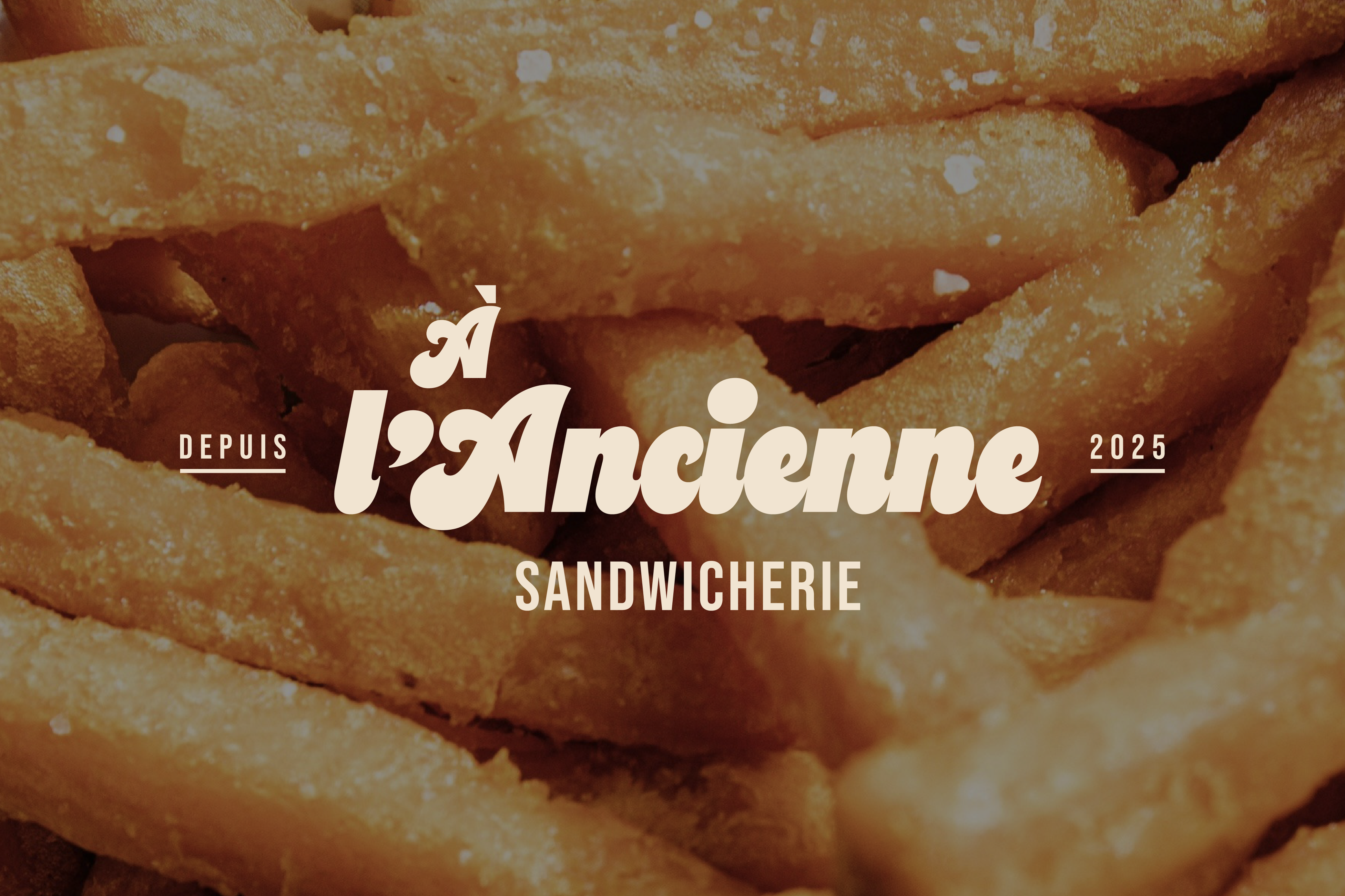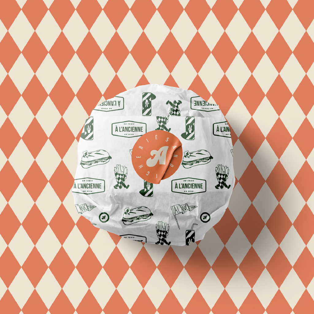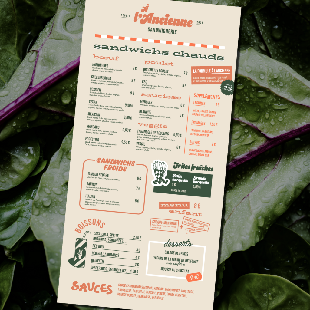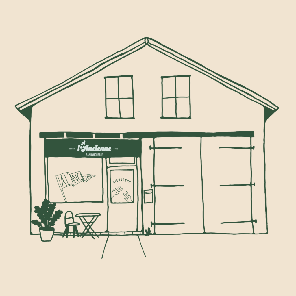 À l’Ancienne, c’est une sandwicherie pensée entre copains, où qualité rime avec convivialité. Ingrédients frais, recettes gourmandes et esprit de partage sont au cœur du projet. J’ai eu le plaisir de créer l’identité graphique de ce lieu chaleureux. Un univers visuel authentique, généreux et un brin rétro, pensé pour refléter l’ambiance fun, réconfortante et pleine de caractère. Résultat : une image de marque sincère (et qui donne vachement faim).